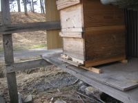 | 飼育場所 基本的にどこでも大丈夫だと思いますが、気をつけたい点がいくつかあります。 ミツバチは、おとなしいと言っても基本的に刺す昆虫なので、他人を刺す恐れのある場所は避けなければいけません。 飼育していると何度か刺されますが、自分が刺される分には何ということもありませんが、他人を刺したとなると、 何かと厄介です。子供を刺したとなると、苦情を言われることにもなります。 隣家の境界のそばはまずいでしょう。道路の際も避けましょう。 自宅飼いをするなら、なるべく敷地の中央になるようにしましょう。 画像はどれも人家から500メートルほど離れた場所です。人を刺す心配、糞害の心配がありません。 飼育してみて初めてわかることですが、糞害も深刻な害です。特に冬場、 巣箱の近くに洗濯物を干していると、茶色の点々がしみのように付きます。 巣箱全面に点々と続いて付いているのが、ミツバチの糞です。夏場は巣箱から離れて糞をするので気がつきませんが、冬場はこのように巣箱の近くに糞をします。特に白い物に付いて、目立ちます。干している洗濯物、止めている車に付くと、家人から嫌がられます。 田んぼ、畑のそばに置くと、薬害でミツバチが多数死にます。家庭菜園程度ならたいした毒性はないのですが、プロの農家が散布する薬品は、毒性が強いのできをつけなければなりません。 田んぼに散布する、カメムシ防除の殺虫剤は、ネオニコチノイド系の毒性の強いものですから気をつけてください。カメムシ防除の薬剤の散布は、地元の農協に問い合わせると、散布日時を教えてくれると思います。 手間がかかりますが、散布後5日の間、別の場所に移動すると、薬害を防ぐことができます。 農協によっては、ネオニコチノイド系の農薬の使用をかくす場合も考えられます。もし教えてくれない時は、保健所に訴えると言って聞き出しましょう。 最近、ミツバチの不足が問題になっていますが、農家の散布する農薬が一番の問題だと私は思っています。 農協の、カメムシ防除の農薬散布の担当者の、毒物を散布しているのだという認識のなさにはあきれます。 まれに、無農薬有機栽培の田んぼがありますが、そこなら安心でしょう。 直射日光の当たる場所は×(特に夏) 洗濯物干し場の近くは×(特に冬から春にかけて) 風通しの悪いところは× クマの出そうな所は× 隣家の住居のすぐそばは× 人様の迷惑にならないところで、ハチが快適に暮らせそうなところはどこか検討してみてください。 |