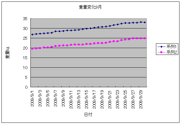 ![]() 重量変化4月分2009年 サクラ開花の後、天候不順で貯蜜が増えない模様。気温が低いと貯蜜を消費しているようです。 |