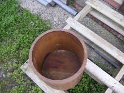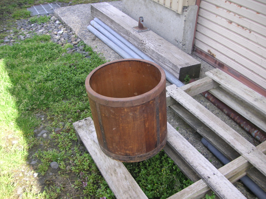 | 待ち桶の製作 ニホンミツバチを捕獲、飼育するには まず、下記画像のような待ち桶を製作しておく必要があります。 できれば12月末までに作り終えて、分封期の4月末まで風雨にさらして、 木の匂いやアクを抜いておかなければなりません。 事前の準備が春の捕獲数に影響してきます。 その時になって、あわてて準備してもなかなか捕獲できるものではありません。 私の待ち桶は