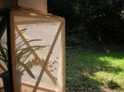 | 網を張った箱も作ってみました。 網は寒冷紗です。 上が蓋になっていて、ここから蘭を出し入れします。 自作する時は、必ず筋交いを入れてください。 ミスマフェットのような大きな鉢を入れます。 筋交いを入れてあるので、重い巣箱を乗せてもびくともしません。 ミスマフェットの誘引力は強力のようで、すぐ蜂を呼びます。 蘭は受粉しなければ花が長持ちしますし、蜂も呼びます。 蘭の手持ちの少ない方は、花にミツバチが付かないように工夫して、1群でも多く捕獲してください。 |