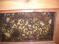 | 重箱式とは上記の画像のように、まさしく重箱を重ねた構造の巣箱のことで、 おおむね30センチ角、高さ10センチ〜15センチの枠を3〜4段重ねています。 この巣箱の長所は何といっても安価なこと、自作できることです。 電動丸鋸があれば自作可能ですが、スライド丸鋸があれば、 正確にまっすぐ切断できるのでお勧めです。 スライド丸鋸は、ホームセンター等で、3〜4万円で販売しています(プロが使うものは12万円前後) 夏の暑さで巣が溶けて落ちるのを防ぐために必ず巣落ち防止の棒を入れてください。 巣落ちしますと、逃居する場合があります。(ほとんど逃居するでしょう) 重箱と同じ寸法の待ち桶を作ると、そのまま上に乗せて飼育できるので、便利です。(画像右) 巣は下のほうへ伸びて行き、上は貯蜜部分となりますので、秋に上の部分を切り取り、 採蜜します。巣が成長したら順次下へ重箱を継ぎ足します。 換気が悪いので、蜜の糖度が78度以下の場合があり、蜜が発酵してしまうことがあります。 換気をよくするため、各自工夫をしてください。 私は最初の1年だけ、重箱で飼育しましたが、その後すべて巣枠式に変更しました。 以上、重箱式巣箱の一例です。重箱式は各飼育者が創意工夫をしているようです。 あなたも重箱式を製作するなら、飼育、採蜜しやすい巣箱を工夫してみてください。 |